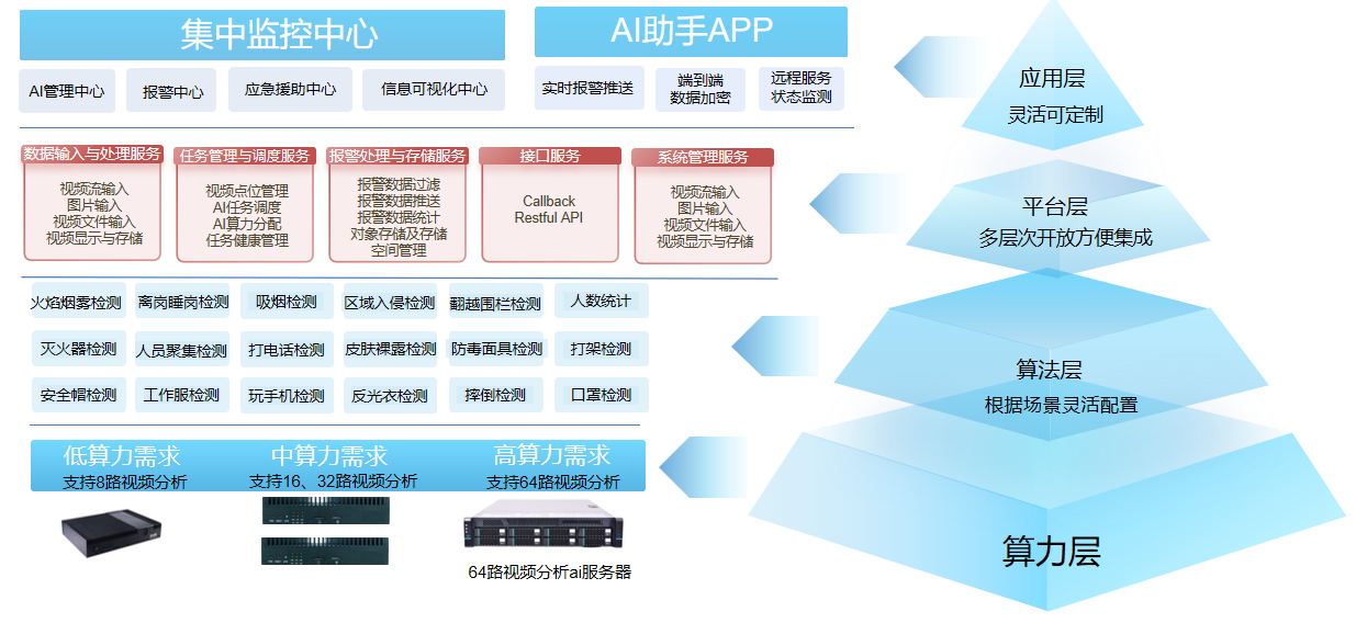 应用层为用户打造了直观便捷的操作界面,包括 AI 管理中心、报警中心、信息可视化中心和应急救援中心。通过实时报警推送、端到端数据加密和远程服务状态监测,用户可随时掌握现场情况,及时做出决策。