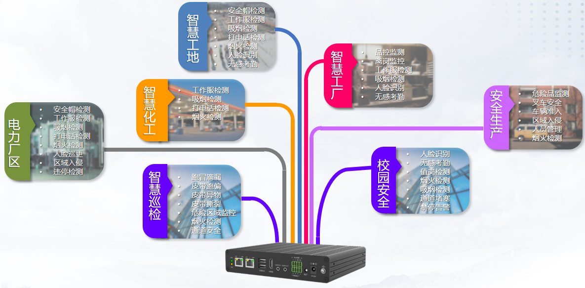 校园安全:烟雾明火、人车碰撞; 智慧巡检:皮带跑偏、跑冒滴漏;