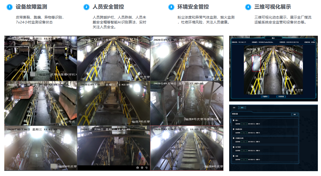 通过热成像、智能AI、物联网技术等,提供输煤皮带系统“少人值守、智能预警”方案。对人员、设备、环境形成整体监测。