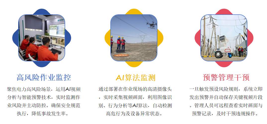 高风险作业监控:高风险作业监控功能,通过AI视频分析与智能预警技术,实时监测与防控作业风险,降低事故发生率,为电力高风险作业提供智能防护。