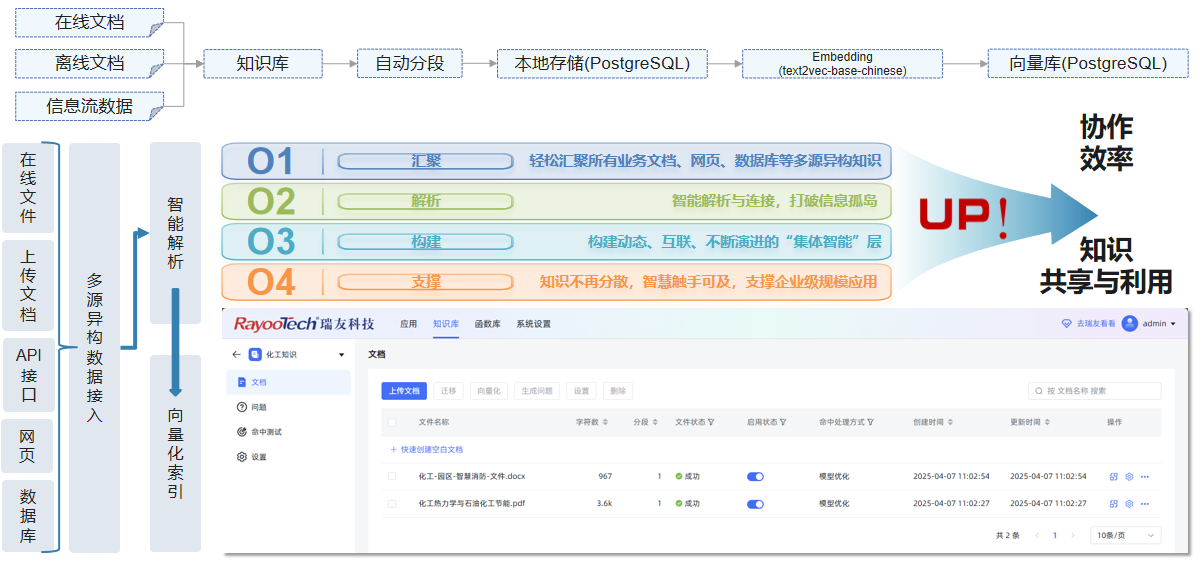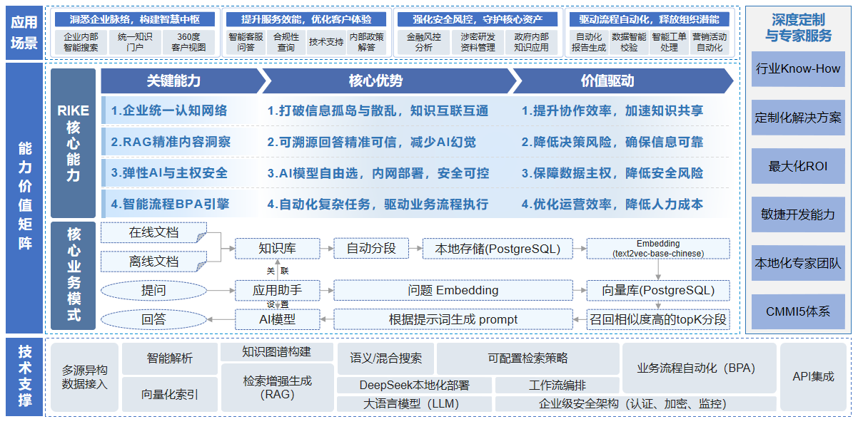 利用人工与自动化数据获取方式,充分发挥RIKE知识虹吸效应,聚合企业离散知识,利用先进AI技术吸收与转化知识储备,将智能AI与实际应用结合,为企业带来基于智能平台的知识中心,并基于RAG精准搜索服务降低AI幻觉,对外提供涵盖知识搜索、合规判定、智能客服、智能报告等服务。