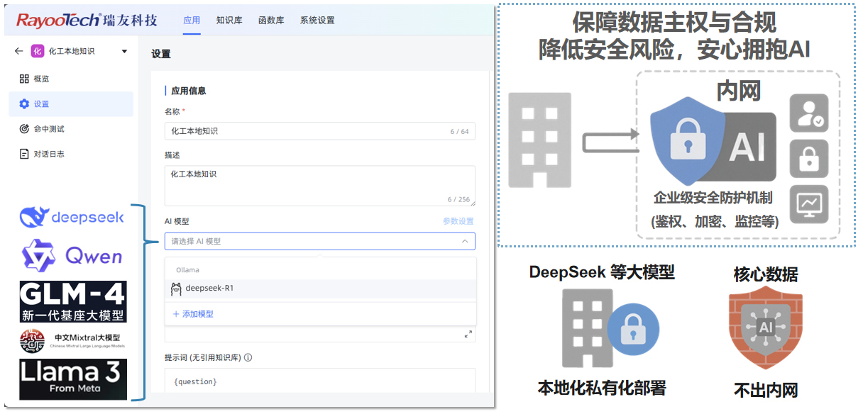 您可以灵活选择AI模型,我们支持DeepSeek等大模型的本地化私有部署。模型在您的环境运行,核心数据不出内网,彻底解决数据安全顾虑。