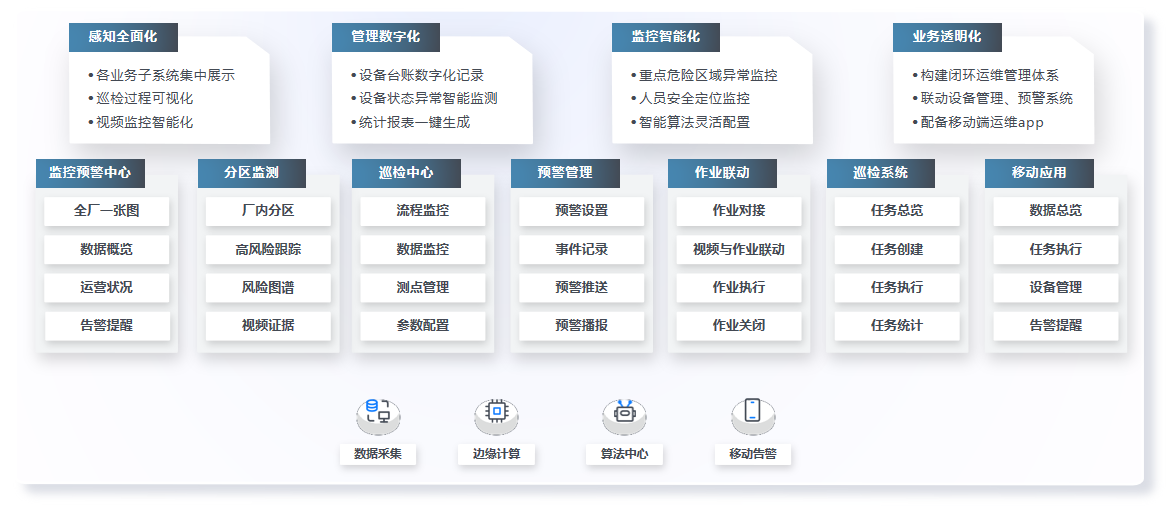 基于现有摄像监控系统(工业电视系统),利用边缘计算技术、人工智能识别技术,集中管控生产区域重点设备,对生产现场所有重点设备进行智能识别分析,智能化管控现场运行设备,有效减少安全事故发生。